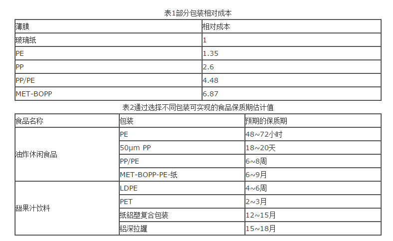 其次,食品保質(zhì)期長短和食品包裝成本也是選擇包裝的影響因素。表1為部分包裝的相對成本,表2為不同包裝可實(shí)現(xiàn)的食品保質(zhì)期(數(shù)據(jù)來自于聯(lián)合國糧食及農(nóng)業(yè)組織發(fā)布的《食品包裝手冊》)。需要注意的是,這些數(shù)值僅為估計(jì)值,并且假定滅菌方法、包裝技術(shù)和貯存方法相同。食品生產(chǎn)企業(yè)可根據(jù)這些信息選擇最經(jīng)濟(jì)的食品包裝。
